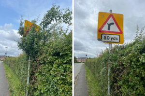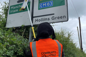 Rixton-with-Glazebrook Community Plan Group volunteers armed themselves with hi-viz vests, brushes, mops, and hedge strimmers to tackle the overgrown and dirty road signs around the parish.